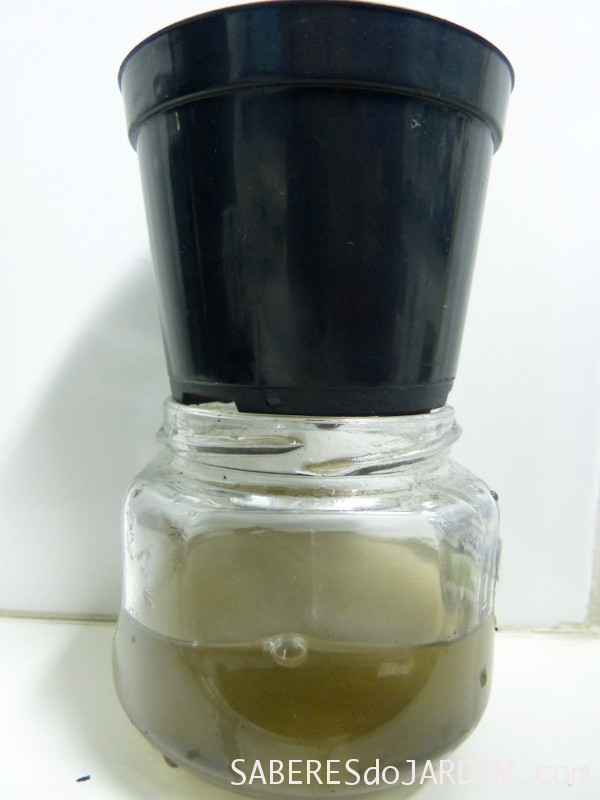 Pensando numa forma de resolver o problema de separar o substrato da água decidi colocar uma camada de uns 2 dedos de lã de vidro no fundo de um vasinho de plástico comum. Preenchi o vasinho com substrato, coloquei em cima do pote de vidro e depois despejei água.