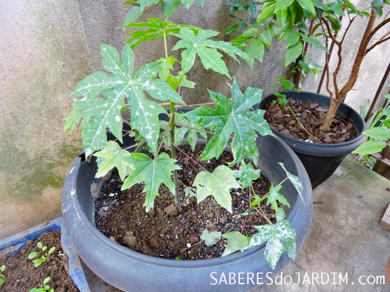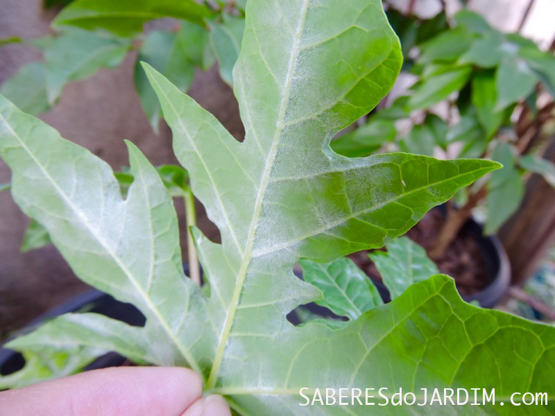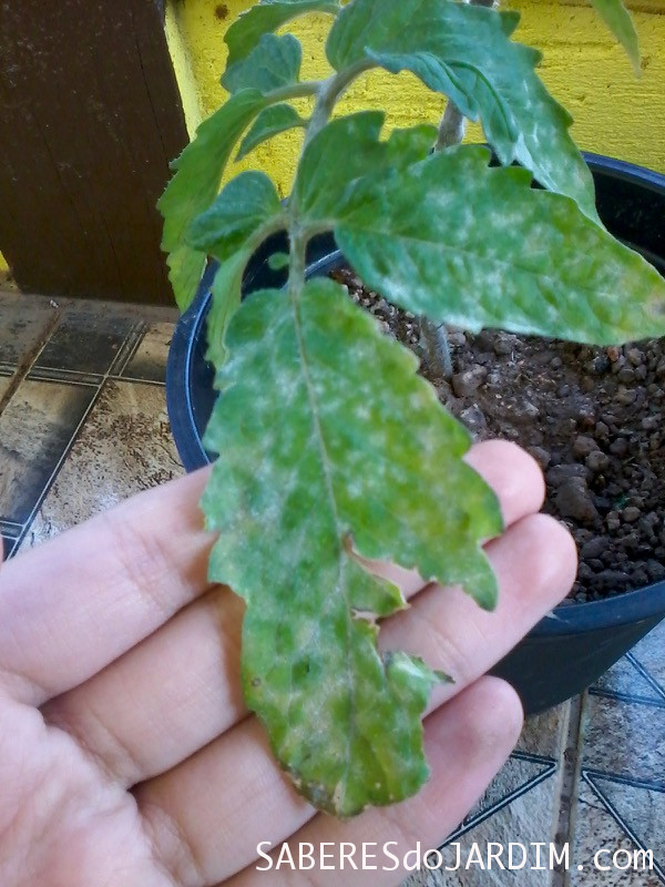 Esse fungo surge como um pó branco nas folhas e é muito comum nos tomateiros. É esse o fungo que eu mostrei nas fotos do post Fungicida Natural para Tomateiros.