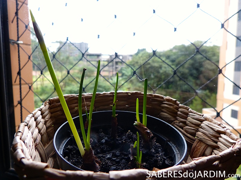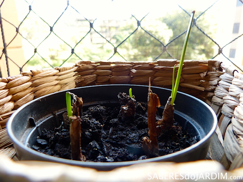 Esses meus bulbos estavam indo muito bem no escritório, foi lá que surgiu a primeira flor, mas decidi transplantar para a varanda e os coloquei em um vaso onde teriam bastante espaço para crescer. Nesse vaso os lírios do vento pegam apenas um pouco de sol, que é o ideal para eles, e mantenho o substrato úmido como eles gostam. Agora espero pelas próximas flores enquanto admiro o crescimento diário das brotações.