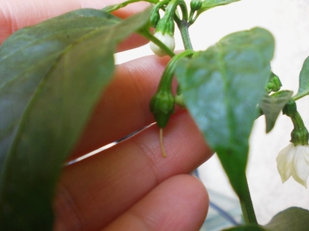 Essa muda que ficou comigo cresceu rápido e se adaptou muito bem ao local que está. As flores vieram logo, mas os frutos demoraram a aparecer por inexperiência minha. Quando vi as primeiras flores caindo sem dar frutos fui pesquisar e encontrei algumas hipóteses para o problema. Coloquei todas em prática e as flores continuavam caindo. Fui pesquisar mais e encontrei no fórum pimentas.org alguém comentando que depois que começou a polinização manual das flores elas pararam de cair e deram frutos. Lá fui eu pegar um cotonete para assediar as flores da minha pimenteira e felizmente o problema foi resolvido.