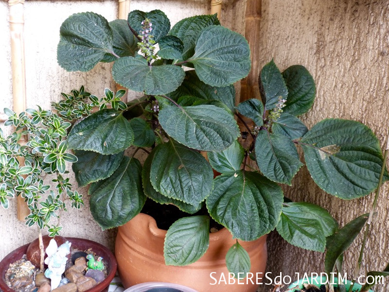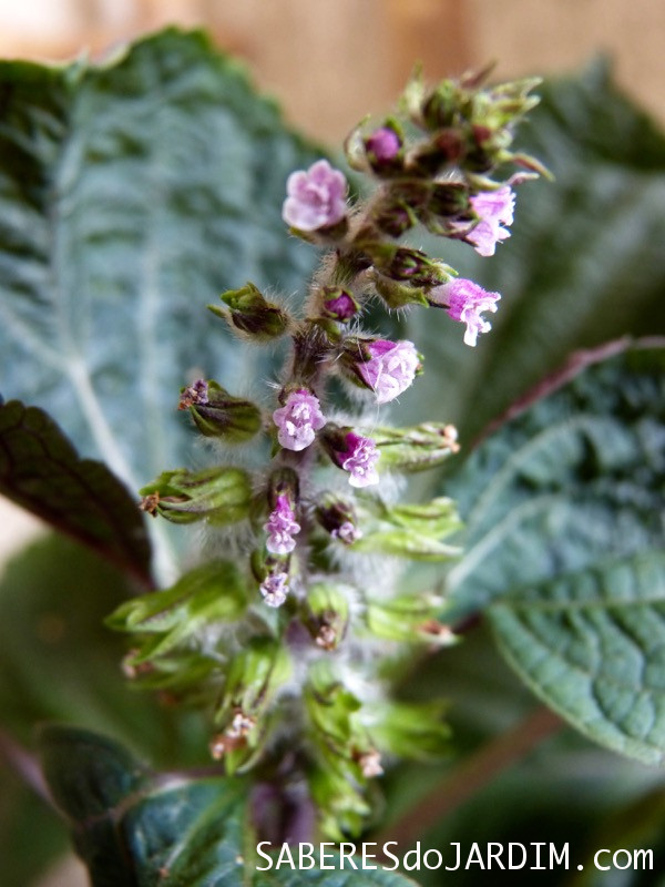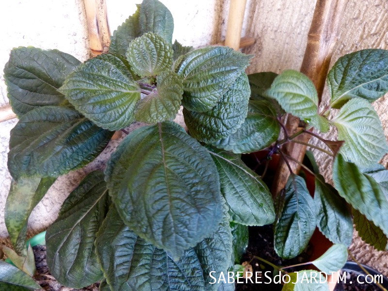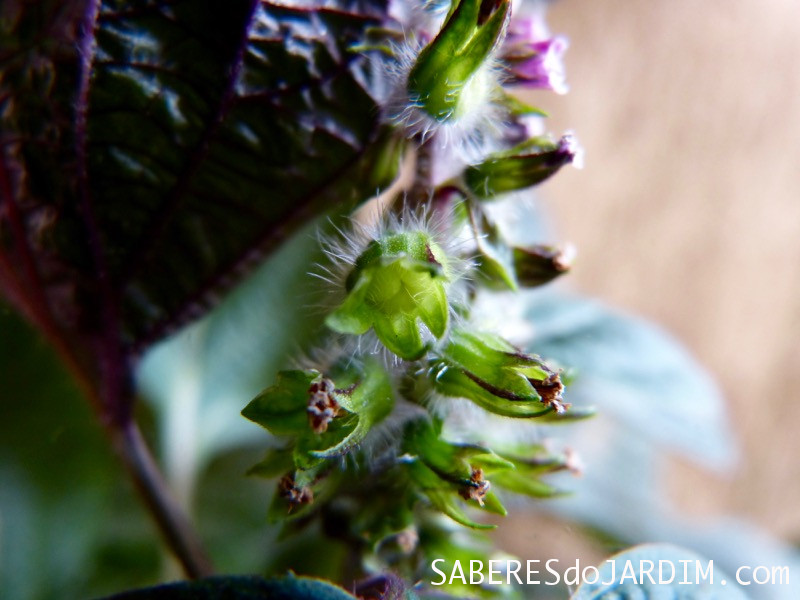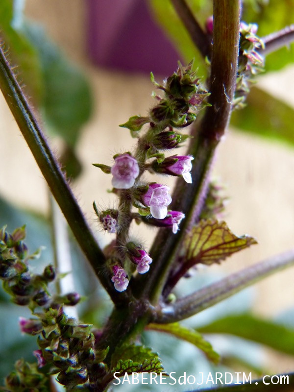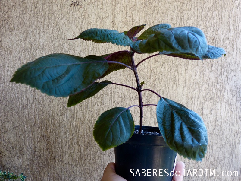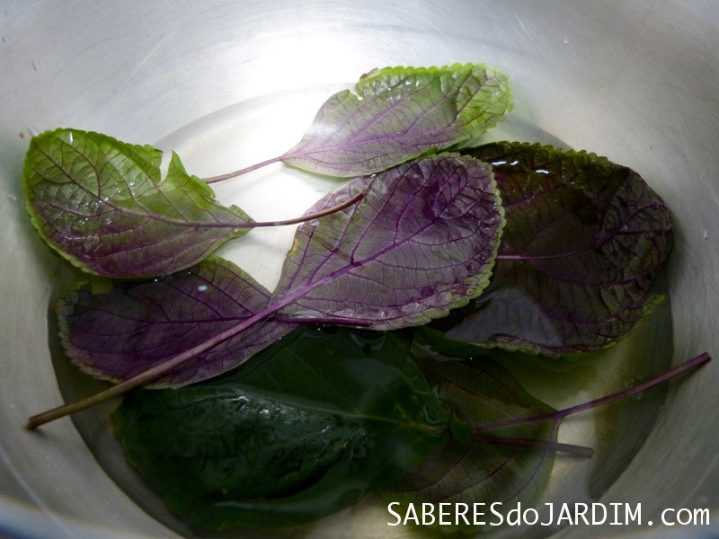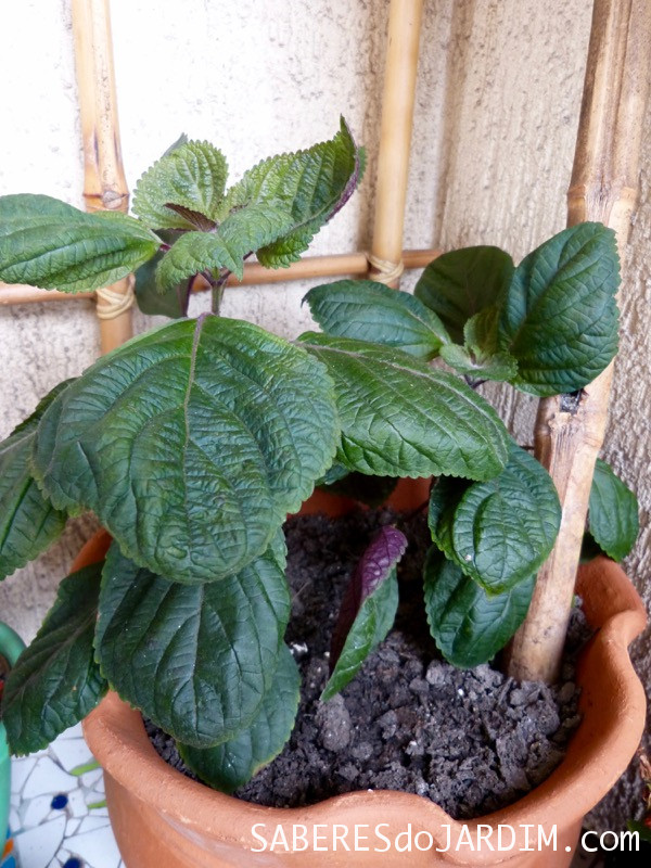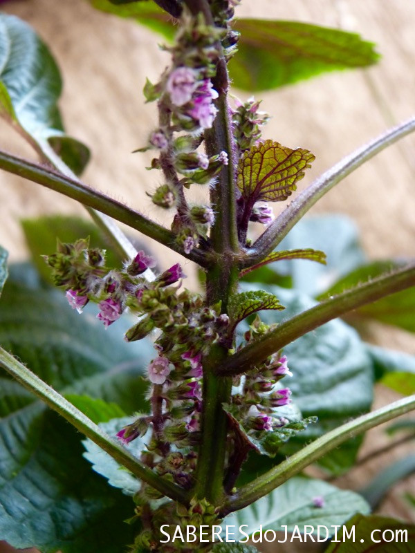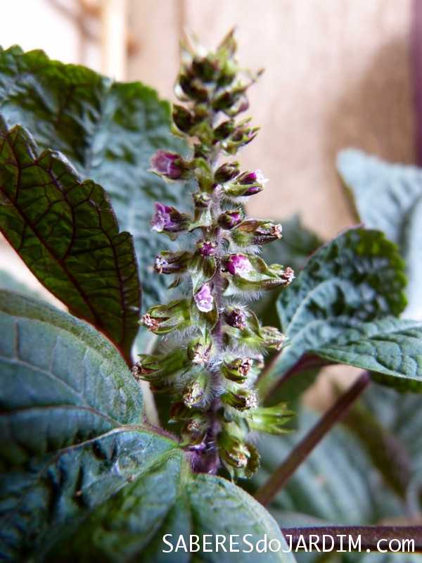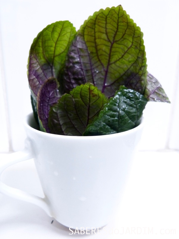 Essa erva é uma planta linda, muito resistente e saborosa. Ela é anual, então depois da floração fica bem feia e deve ser replantada, mas isso não é problema já ela dá muitas sementes e normalmente elas se propagam sozinhas, germinando por onde caem. Eu conheci como shiso, mas também é comum ver como perilla, já que seu nome científico é perilla frutescens.