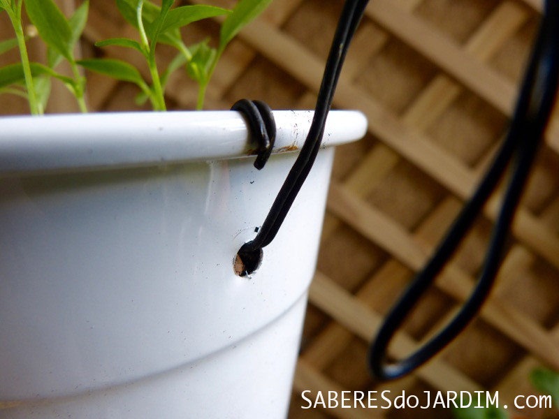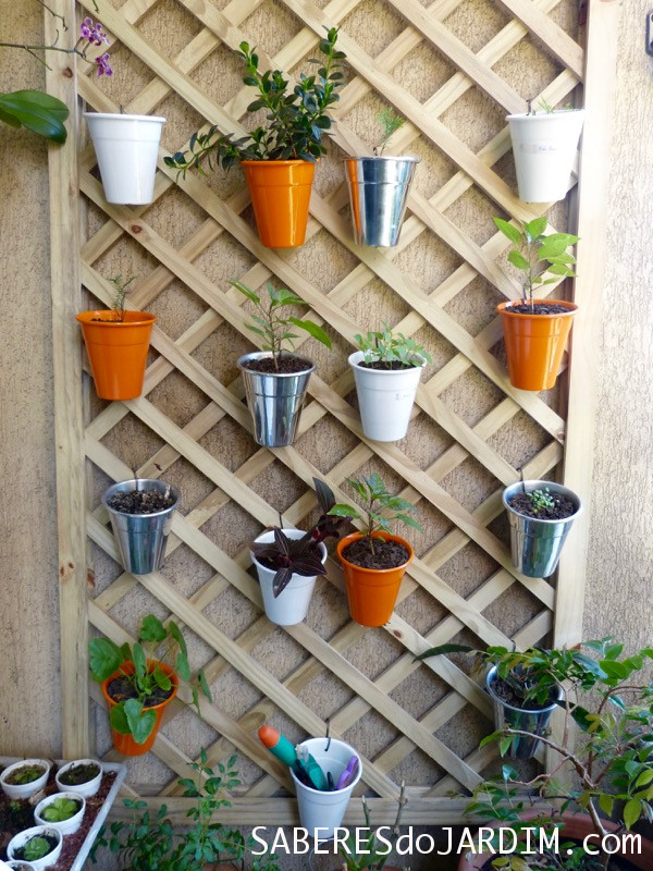 A princípio optei por colocar na treliça vasos de metal. Os que eu usava na mesa eram de plástico e ambos apresentam a mesma desvantagem, retém bastante umidade.