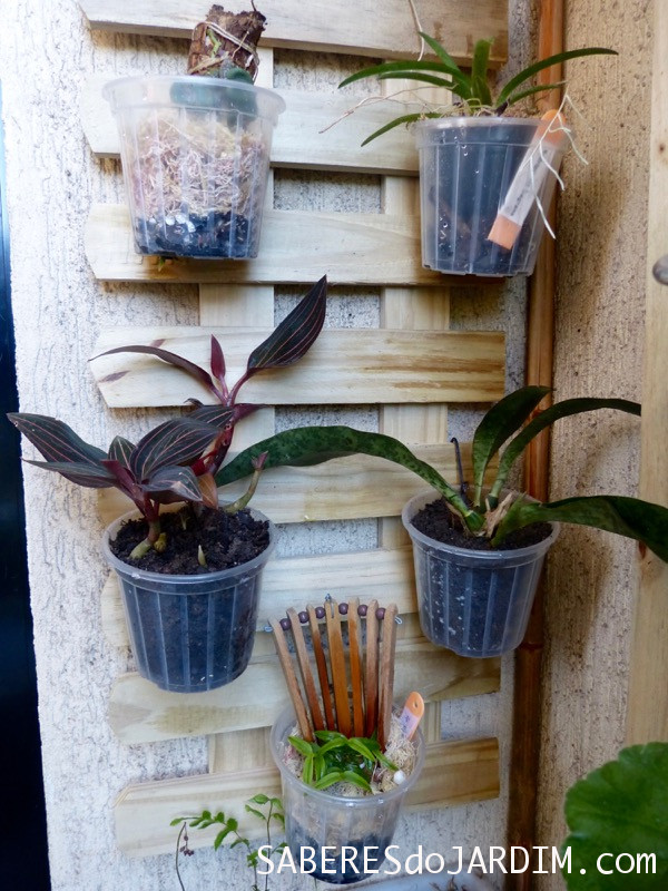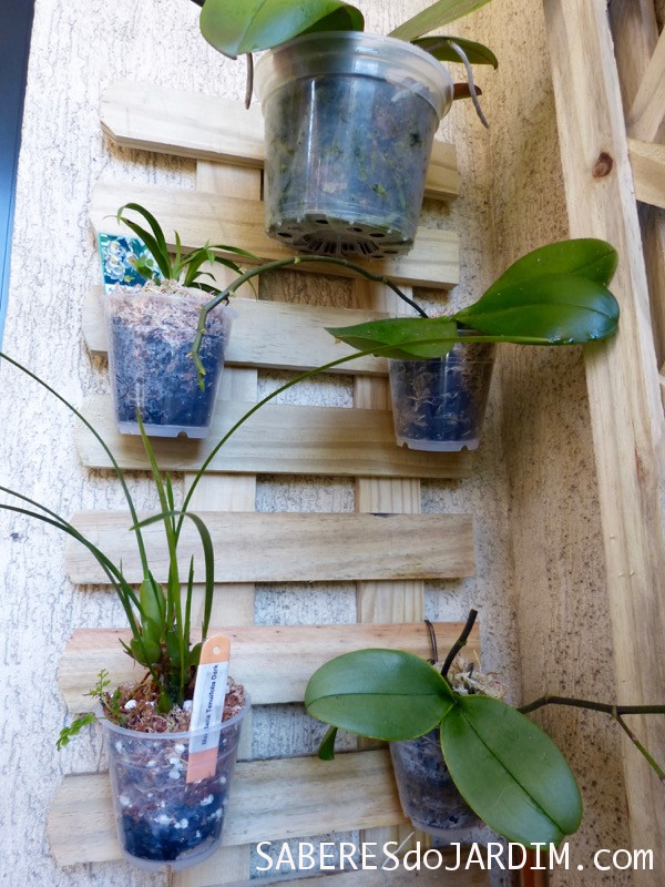 Nessa treliça eu usei vasos de plástico transparente, mudando apenas a composição do substrato de uma espécie para outra, quando necessário. Esses vasos transparentes são excelentes para que eu possa observar as raízes das orquídeas e isso é fundamental para mim já que ainda não tenho tanta experiência com elas.